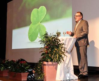Oberbürgermeister Thomas Feser bei seiner Rede beim traditionellen Neujahrsempfang im Rheintal-Kongress-Zentrum vor rund 550 Gästen aus Politik, Wirtschaft und Gesellschaft.