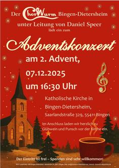 Am Sonntag, den 07.12.2025 um 16:30 Uhr lädt der „Chorwurm“ unter der Leitung von Daniel Speer herzlich in die Katholische Kirche Bingen-Dietersheim ein.