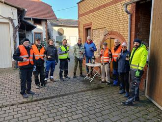 Die Weihnachtsbeleuchtung wurde komplett durch den Büdesheimer Einzelhandel angeschafft. Inzwischen müssen auch hier die ersten Teile ausgetauscht werden, aber die Lebensdauer ist eindeutig höher als bei klassischen Glühbirnen. Damit auch das Gemütliche nicht zu kurz kommt, lud Winzer Peter Ewen die Aktiven schon fast traditionell zum Glühwein ein. Anschließend gab es dann noch heiße Fleischwurst mit Brötchen und natürlich noch Glühwein zum Aufwärmen. Auf dem Foto v. l.n. r.: