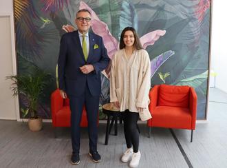 Oberbürgermeister Thomas Feser und Baby-Beach-Geschäftsführerin Hanna Liu freuen sich, dass BIN-WLAN so gut angenommen wird.