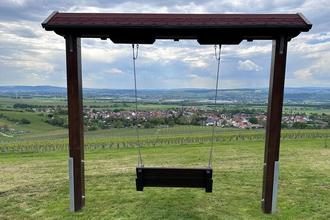 Kein Problem: Von der Rheinhessenstraße biegt ihr auf den Klosterweg ab und folgt dem Weg bis zur Gabelung. Dort haltet ihr euch rechts und folgt weiter dem landwirtschaftlichen Weg den Berg hinaus. Bereits hier ist die Schaukel gut zu sehen. Ihr passiert nur noch die alte Kelter und biegt vor der Kurve rechts auf einen Schotterweg ab. Schon seid ihr da.