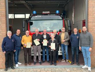 Wie jedes Jahr galt es auch verdiente Mitglieder für ihre langjährige Treue zu ehren. Für 25 Jahre Mitgliedschaft wurde Marliese Reidel (6.v. l.) geehrt. Auf 40 Jahre Mitgliedschaft blicken Edgar Kruger (5.v. l.), Claus Pickel (4.v. l.) und Hermann Rauth (7.v. l.) zurück. Für 50 Jahre Mitgliedschaft konnte Manfred Reibel (3.v. l.) geehrt werden. Der Oberbürgermeister der Stadt Bingen, Thomas Feser (3.v. r.), überbrachte ebenfalls seine Glückwünsche und bedankte sich beim Förderverein für die große Unterstützung der Feuerwehr.