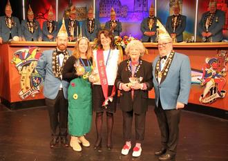 (v. l.) Sitzungspräsident Dennis Fischer, Anna Schadt, Miss Kreppel Marianne Zengel, Ehrensitzungspräsident Wolfgang Heinz