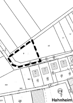 Der genaue räumliche Geltungsbereich des Bebauungsplanes ist in der obenstehenden Planskizze durch eine dick gestrichelte Linie umrandet (ohne Maßstab) und umfasst die Grundstücke der Flur 10 Nr. 9 vollständig und Flur 10 Nr. 8 teilweise.