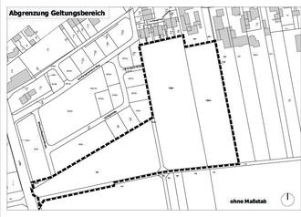Der genaue Geltungsbereich des Bebauungsplanentwurfes ist in der oben stehenden Planskizze durch eine dick gestrichelte Linie umrandet und umfasst die Grundstücke mit der amtlichen Lageplanbezeichnung Flur 10 Nr. 150/4, 152/8, 153/1, 157/5, 158 jeweils vollständig und Flur 10 Nr. 170 teilweise.