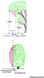 Der Rückschnitt muss in einer lichten Höhe von 2,50 m bündig bis zur Grundstücksgrenze erfolgen. Ein Überhang über diese Höhe hinaus ist nur dann zulässig, wenn hierbei ein Abstand von mindestens 0,50 m zur Fahrbahn eingehalten wird.