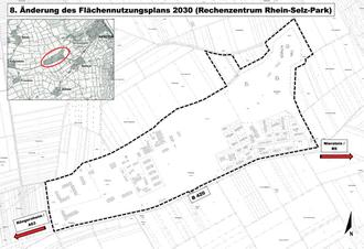 Der genaue Geltungsbereich der 8. Änderung des Flächennutzungsplanes 2030 für den Bereich des Rhein-Selz-Parks ist in der oben stehenden Planskizze durch eine schwarze Linie umrandet.