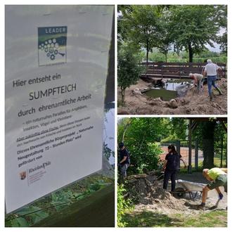 Zur Aufwertung des Platzes und naturnahen Umgestaltung wird der Fischteich in einen Sumpfteich umgewandelt und unter ökologischen Gesichtspunkten neue Gewächse gepflanzt. Ein toller ehrenamtlicher Einsatz!