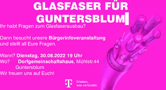 Am Dienstag, den 30.08.2022 um 19 Uhr findet eine Informationsveranstaltung zum Glasfaserausbau im Dorfgemeinschaftshaus in Guntersblum statt. Hier haben alle Bürgerinnen und Bürger die Möglichkeit, sich über den bevorstehenden Glasfaserausbau, die Möglichkeiten eines Glasfaseranschlusses sowie die Produkte und Tarife der Telekom informieren zu lassen.