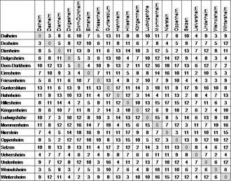 Tabelle: Auf ganze km gerundete Entfernungen zwischen den Ortsmitten der Städte und Gemeinden der VG Rhein-Selz
