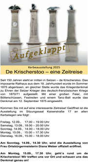 Im Mittelpunkt steht der „Krischerstoo“ – das Kriegerdenkmal auf dem freien Platz, das 1875 am 12. September vor 150 Jahren mit großer Feier, Böllerschüssen, Festreden und einem Tanzball feierlich eingeweiht wurde.