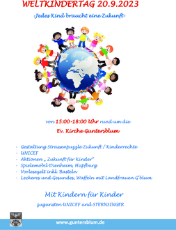 Wie bereits im vorigen Jahr möchten wir in Guntersblum den Weltkindertag am 20.9.2023 zugunsten UNICEF und der STERNSINGER gemeinsam mit allen Kindern feiern. UNICEF Deutschland und das Deutsche Kinderhilfswerk fordern mit dem Motto „ Jedes Kind braucht eine Zukunft!“ ein stärkeres politisches Engagement für eine gerechte und lebenswerte Zukunft junger Menschen. Ganz im Zeichen dieses Mottos wird es rund um die ev. Kirche Guntersblum von 15:00-18:00 Uhr viele Mitmachaktionen und –stationen geben, bei denen Kinder im Mittelpunkt stehen. Selbstverständlich wird für das leibliche Wohl mit Leckereien gesorgt sein. Wir laden Sie und Ihre Kinder ganz herzlich ein, diesen Tag mit uns zu feiern, zu gestalten und in Austausch zu treten. Lassen Sie uns ein Zeichen setzen: Von Kindern für Kinder!