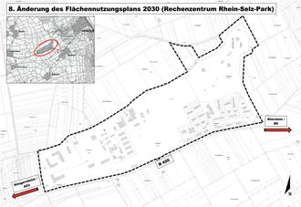 Der genaue Geltungsbereich der 8. Änderung des Flächennutzungsplanes 2030 für den Bereich des Rhein-Selz-Parks (Rechenzentrum und Gewerbe im Rhein-Selz-Park) ist in der obenstehenden Planskizze durch eine schwarze Linie umrandet.