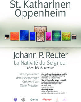 ... Seine Werke entstehen oftmals mit und aus der Musik. Durch sie kann die Zeit ein Gesicht bekommen, sie macht etwas aus ihrer Gleichgültigkeit und sie lässt Räume in uns entstehen. Die Musik ist das Lebens- und Schaffenselexier dieses Malers, mit ihr betritt er seine Bildwelt. Manchmal wird eine Musik explizit zum Thema, so in dem Stelenzyklus „Les Corps Glorieux“ und in den Bildern „La Nativité du Seigneur“, beides Werke zu Kompositionen von Olivier Messiaen. Implizit ist die Musik in allen Arbeiten Johann P .Reuters vorhanden. Man kann sagen, dass der kreative Impuls für diesen Künstler von der Musik ausgeht ... Claudia Breinl.