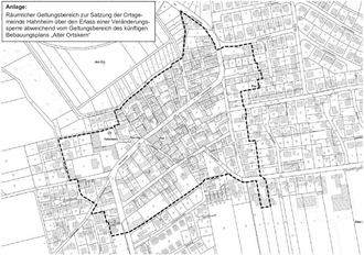 Der räumliche Geltungsbereich der Veränderungssperre ist abweichend vom Geltungsbereich des Bebauungsplans „Alter Ortskern“ und ergibt sich aus der beiliegenden Karte (räumlicher Geltungsbereich), die als Anlage zur Veränderungssperre Teil der Satzung ist.