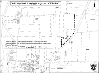 Der Gemeinderat der Ortsgemeinde Köngernheim hat in seiner Sitzung am 28.11.2024 beschlossen, für das in § 2 bezeichnete Gebiet einen Bebauungsplan mit der Bezeichnung „Friedhof“ aufzustellen. Die Planung sieht die Festsetzung eines Friedhofs zur Erhaltung und maßvollen Weiterentwicklung des Friedhofbereiches vor. Zur Sicherung der Planung wird für dieses Gebiet eine Veränderungssperre erlassen.