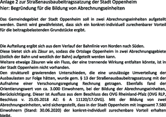 | (1) | Die Stadt Oppenheim erhebt wiederkehrende Beiträge für die Herstellung und den Ausbau von Verkehrsanlagen nach den Bestimmungen des KAG und dieser Satzung. |