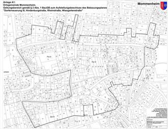Der räumliche Geltungsbereich umfasst den innerörtlichen Bereich der Ortsgemeinde Mommenheim. Die Abgrenzung des Plangebietes erfolgt durch die beidseitige Bebauung im Bereich der Hindenburgstraße, Schulstraße, Grundgasse, Zwerchgasse und Wiesgartenstraße sowie teilweise im Bereich der Gaustraße, Moselstraße, Bahnhofstraße und Rheinstraße.