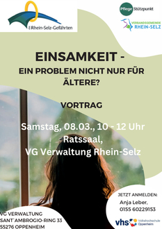 "Der Inklusionsbeirat der Verbandsgemeinde Rhein-Selz möchte auf den Vortrag zum Thema Einsamkeit aufmerksam machen, da dies ein Thema ist, welches auch Menschen mit Beeinträchtigungen häufiger betrifft. gez. Sina-Katharina Scherer, 1. Vorsitzende des Inklusionsbeirates"