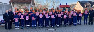 Viele glückliche Gesichter bei unserem Feuerwehrnachwuchs. Am 18.02.2023 hat der Jugendfeuerwehrwart unserer Verbandsgemeinde Timo Jung bei den Jugendlichen die Jugendflamme 1 abgenommen. Die Aufgaben bearbeiteten die Mädchen und Jungen einzeln. Hierzu gehörten: Notruf absetzen, drei Feuerwehrknoten anfertigen und drei einfache feuerwehrtechnische Aufgaben erledigen. Die bestandene Stufe 1 der Jugendflamme ist die Voraussetzung dafür, dass die Jugendlichen an der Abnahme der Stufe 2 teilnehmen dürfen. Zur Übergabe des Abzeichens und der Urkunde kam auch der stellvertretende Wehrleiter der VG Axel Pitthan, der ebenfalls den Absolventen gratulierte.