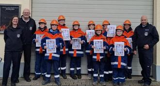 Neun neue Mitglieder der Jugendfeuerwehr haben erfolgreich die Prüfung zur Jugendflamme 1 absolviert. Auf der Aufgabenliste standen unter anderem das Stechen von drei Feuerwehrknoten, das Absetzen eines Notrufs sowie das Lösen einfacher feuerwehrtechnischer Aufgaben. Alle Teilnehmerinnen und Teilnehmer bestanden die Prüfung auf Anhieb.