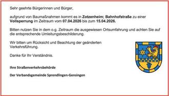 aufgrund von Baumaßnahmen kommt es in Zotzenheim; Bahnhofstraße zu einer