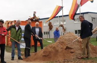 Karlheinz Lamby (Dromersheim), Peter Josef Schumacher, Thomas Feser, Manfred Scherer, Wolfgang Metzenroth, Jürgen Port und Eva-Maria-Oster (v. l.) beim Spatenstich