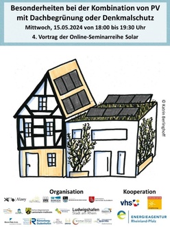 Die Anmeldung zur Veranstaltung „Besonderheiten bei der Kombination von PV mit Dachbegrünung oder Denkmalschutz“ oder zur gesamten Reihe erfolgt über die Webseite der Kreisvolkshochschule Mainz-Bingen.