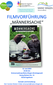 Wie können wir alle zusammenleben? Um dieser Frage auf den Grund zu gehen, sind Interessierte zu einem Filmabend eingeladen: Gezeigt wird die Dokumentation „Männersache“ am Mittwoch, den 12. Juni um 19.30 Uhr im Ingelheimer Kreistagssaal. Darin zeigt Filmemacherin Anita Leyh wie es ist, nach der Flucht in einem fremden Land anzukommen - aus männlicher Perspektive.