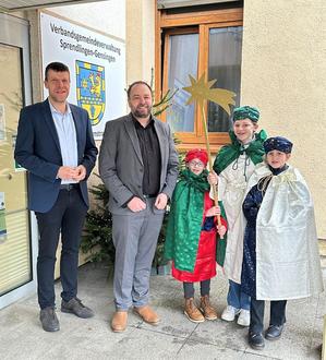 Am Dreikönigstag besuchten die Sternsingerinnen der katholischen Michael-Gemeinde Sprendlingen die Verbandsgemeindeverwaltung, um auch hier den Segen „Christus segne dieses Haus“ für das Jahr 2025 zu überbringen. Empfangen wurden sie vom Ersten Beigeordneten der Verbandsgemeinde, Oliver Wernersbach, und von Büroleiter Benjamin Hilger.