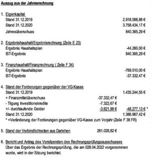 | 3. | Beratung und Beschlussfassung über die Feststellung des geprüften Jahresabschlusses 2020 der Ortsgemeinde Horrweiler sowie die Entlastung des Ortsbürgermeisters und der Ortsbeigeordneten, soweit sie den Ortsbürgermeister vertreten haben, sowie dem Bürgermeister der Verbandsgemeinde Sprendlingen-Gensingen und den Beigeordneten, soweit sie den Bürgermeister vertreten haben nach § 114 Nr. 1 der Gemeindeordnung (GemO) |