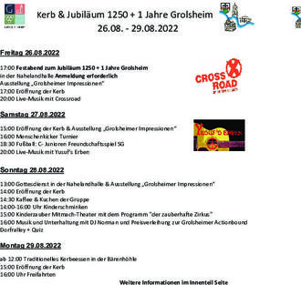 | 15:00 | Eröffnung der Kerb & Ausstellung „Grolsheimer Impressionen“ |