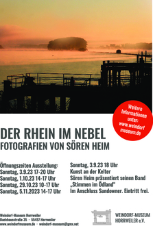 Zahlreiche solcher Nebelfotografien zeigt der Binger Schriftsteller Sören Heim ab 3. September im Weindorf-Museum Horrweiler. „Als ich irgendwann im ersten Herbst der Corona-Pandemie zum ersten Mal vor einer solchen Nebelkulisse stand, konnte ich es kaum glauben“, berichtet Heim. „Der Rhein dampfte. Nicht nur ein bisschen. Der Nebel steigt in dicken Schwaden auf, vom Himmel hängen die Wolken herab. Nebel und Wolken vereinigen sich. Und mitten in diesem Nebelmeer ankert ein Schiff. Die Sonne geht auf. Und plötzlich wird alles golden. In der Folge habe ich mich dann entschlossen, immer wieder sehr früh aufzustehen, um bewusst zu den Zeiten den Rhein aufzusuchen, wenn am ehesten solcher Nebel zu erwarten ist.“