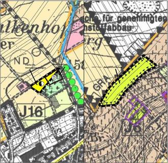 Links dargestellt in gelb ist die Fläche für Versorgungsanlagen und rechts die Ausgleichsflächen zum Bebauungsplan „Auf dem Schleich“