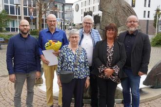 Bürgermeister Manfred Scherer, Ortsbürgermeisterin Sandra Bergmann sowie Familienmitglieder gratulieren ihm zu dieser besonderen Auszeichnung.