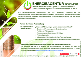 22. September 2022, „Heizen mit Wärmepumpe - passt das zu meinem Haus?“, 18:00 - 19:30 Uhr