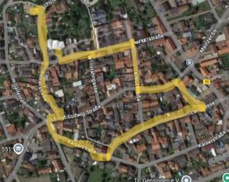 Beginn Kath. Kirche Römer Straße – Kreuzstr. – Ernst-Ludwig-Str.-Grabenstr.-Langgasse-Kaiserstr.-Ernst-Ludwig-Str.-Römerstr.-Schulstraße