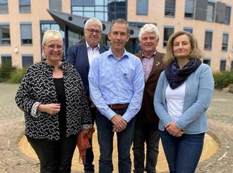 Thomas Geyer mit Ehefrau (re.), Landrätin Dorothea Schäfer, Bürgermeister Scherer (hinten li.), und sein Vater Ludwig Geyer (hinten re.)