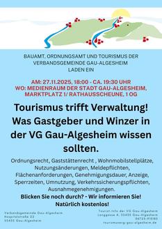 Die Verbandsgemeinde Gau-Algesheim lädt gemeinsam mit dem Bauamt, Ordnungsamt und dem Tourismusbüro zu einem informativen Abend unter dem Motto „Tourismus trifft Verwaltung“ ein.