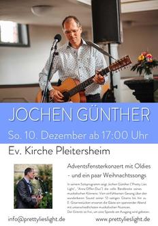 | 17:00 Uhr | Popmusikalisches Adventskonzert mit Jochen Günther in der Pleitersheimer Kirche: In seinem Soloprogramm zeigt Jochen Günther („Pretty Lies Light“, „Anna Offen Duo“) die volle Bandbreite seines musikalischen Könnens: Vom einfühlsamen Gesang über den wunderbaren Sound seiner 12-seitigen Gitarre bis hin zu E-Gitarre-Stücken erwartet die Gäste ein spannender Abend mit unterschiedlichsten musikalischen Nuancen. Wir freuen uns auf herzerwärmende „Oldies“ ebenso wie auf einige Weihnachtshits. Der Eintritt ist frei, um eine Spende am Ausgang wird gebeten. |