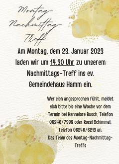Der nächste Treff wird am Montag, den 23. Januar 2023 um 14.30 Uhr stattfinden und wir hoffen, viele von euch begrüßen zu können.