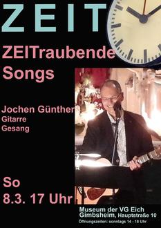 „ZEITraubende Songs“ stehen danach um 17:00 Uhr auf dem Programm. Wie in den letzten Jahren wird der bekannte Guntersblumer Sänger und Gitarrist Jochen Günther auch dieses Jahr ein auf das Ausstellungsthema ausgerichtetes Programm mit Liedern aus Pop, Rock und Folk spielen, dieses Jahr begleitet von Martin Gilbert aus Oppenheim. ZEIT/Time ist in der Geschichte der Popmusik ein immer wiederkehrendes Thema, mit einem tiefen Blick in 50 Jahre Popgeschichte werden die beiden Musiker dem Publikum viele bekannte und weniger bekannte Beispiele präsentieren nach dem Motto des amerikanischen Rockstars Tom Petty:
