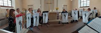 Da die Glocken derzeit nicht zum Gottesdienst rufen, hat der Posaunenchor diese Aufgabe übernommen und stattdessen vor der Kirche eine Fanfare erklingen lassen.