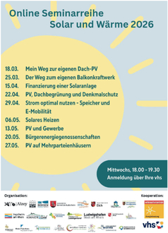 In den unabhängigen und umfassenden Online-Informationsveranstaltungen mittwochs von 18:00 Uhr bis 19:30 Uhr wird es eine allgemeine Einführung in verschiedene Themen rund um das Thema „Solar, Wärme und Energie“ geben. Anmeldung auf der Homepage der Kreisvolkshochschule Alzey-Worms.
