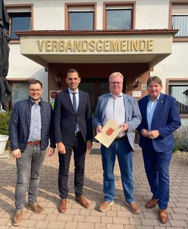(v.r.) Landrat Heiko Sippel, Beigeordneter Ernst-Wilhelm Becker, VG-Bürgermeister Maximilian Abstein sowie Fachbereichsleiter Kevin Zakostelny bei der Übergabe des Bewilligungsbescheids für den Kita-Neubau in Alsheim.
