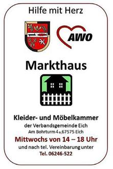 Ab Mittwoch, 08.04.2026 ist das AWO-Markthaus in Eich, Am Bohrturm 4a, wieder jeden Mittwoch von 14:00 – 18:00 Uhr geöffnet.
