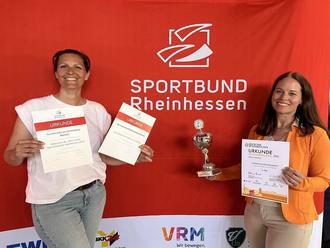 Frau Volk und Frau Lunnebach freuten sich für die Grundschule am Sonnenberg Alsheim vom Präsidenten des Sportbundes Rheinhessen dürfen.
