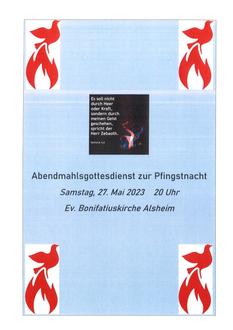 | 20:00 Uhr | gemeinsamer Abendmahlgottesdienst der Ev. Kirchengemeinden Alsheim, Eich, Gimbsheim, Hamm, Ibersheim, Mettenheim und Rheindürkheim zur Pfingstnacht in Alsheim mit Pfarrer Markus Müsebeck |