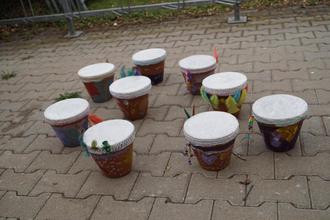 Das Blasorchester des TV Gimbsheim bastelte afrikanische Trommeln, die im Laufe des Tages als Begleitinstrument zu afrikanischen Tänzen dienten. Auch diese Trommeln durften die Kinder am Ende des Tages mit nach Hause nehmen.