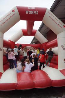 Die ehrenamtlichen Mitglieder des DRK OV Altrhein übten mit den Kindern, wie Verbände richtig angelegt werden sowie die stabile Seitenlage. Eine riesige Hüpfburg sorgte für mächtigen Spaß.
